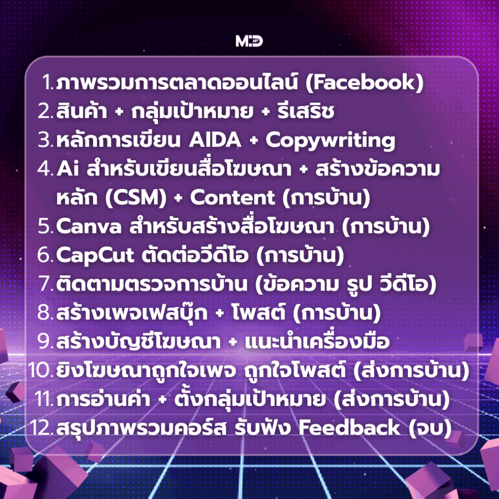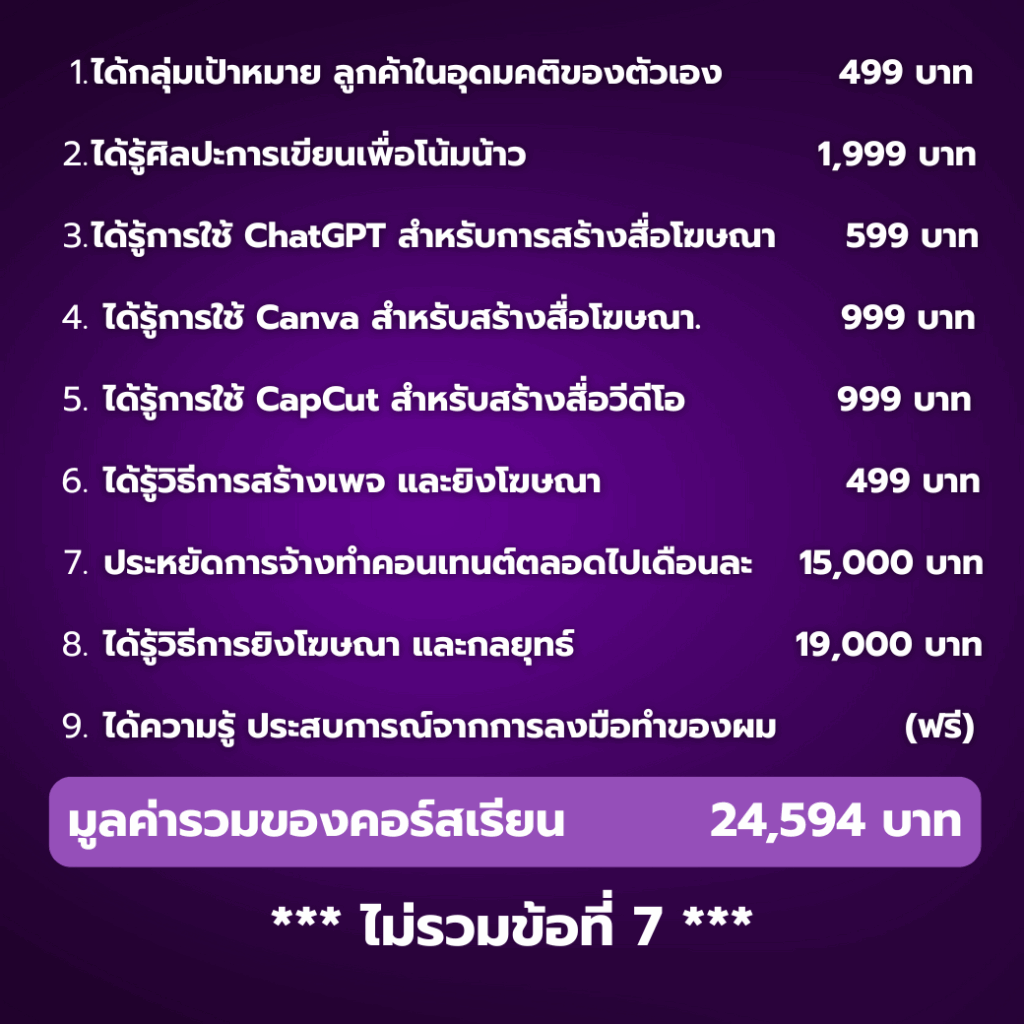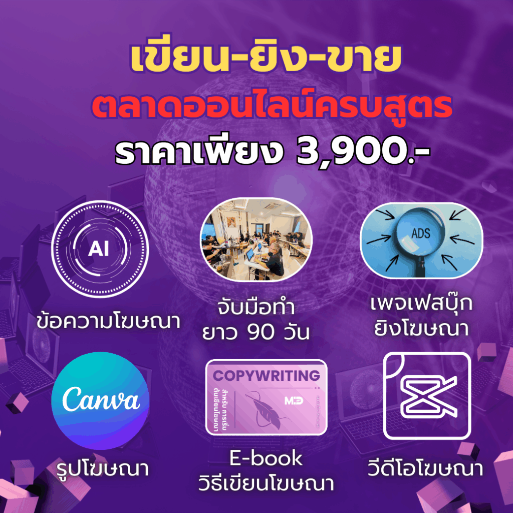 course เขียน-ยิง-ขายด้วยวิธีบอกให้รู้ทำให้ดู จับมือทำให้มีเพจเฟสบุ๊ก พร้อมขาย นี่คือคอร์สสอนสร้างสื่อโฆษณา โดยใช้ AI,Canva,CapCut สำหรับคนที่ต้องการเริ่มต้นนับ 1 ตลาดออนไลน์ "การเขียน ทำรูปภาพและวีดีโอ" ให้ตรงกลุ่มเป้าหมาย เน้นลงมือทำ กดจองด่วน! ก่อนที่นั่งเต็ม แอดไลน์ โทร 064-993-6341 คอร์สเรียนนี้ประกอบด้วยทฤษฏี 20% ปฏิบัติ 80% โดยจับมือทำยาว 90 วันให้คุณทำเป็น คิดต่อยอดได้เอง แม้ไม่มีพื้นฐานการตลาดออนไลน์มาก่อน ผมเดาว่าคุณอาจจะเคยเจอปัญหาแบบเดียวกับผม ❌ มีหน้าร้าน ยอดขายตก❌ อยากขายของออนไลน์ เริ่มต้นไม่ถูก❌ ไม่มีพื้นฐาน กลัวตามคนอื่นไม่ทัน❌ เขียนคอนเทนต์ ทำรูปภาพ และวีดีโอไม่เป็น❌ อยากทำเพจเฟสบุ๊กขายของ ไม่รู้จะเริ่มยังไง❌ ไอเดียตัน ไม่รู้จะโพสต์อะไร❌ ไม่กล้าออกกล้อง หรือกล้าออกแต่ไม่รู้จะพูดเรื่องอะไร❌ ทดลองยิงโฆษณา แต่ไม่เกิดยอดขาย เห็นด้วยมั้ยครับ? ปัจจุบันถ้าจะขายของออนไลน์ ทักษะเหล่านี้คือพื้นฐานจำเป็น ถ้าใช่! คุณสามารถมีติดตัวได้ครบแล้ววันนี้ ข้อผิดพลาดที่ผมเจอตอนเริ่มต้น ขายของออนไลน์ 🎯 ไม่เข้าใจการเขียนเพื่อโน้มน้าว🎯 คอนเทนต์เหวี่ยงแห จ้องขายอย่างเดียว🎯 แบรนด์ไม่ชัดเจน ไม่มีอัตลักษณ์ ไม่น่าเชื่อถือ🎯 สินค้าไม่ชัดเจน + รู้จักกลุ่มเป้าหมายไม่ดีพอ🎯 ใช้ Ai และเครื่องมือไม่เป็น ไอเดียตัน เพจร้าง🎯 ขาดกลยุทธ์ในการยิงโฆษณาเป็นระบบ ขาดทุนยับ แรงบันดาลใจในการเปิดคอร์ส จากการที่เคยเป็นนักเรียนมาหลายคอร์ส ทั้งราคาถูก ราคาแพง และได้ลองผิดลองถูกเป็นเวลานาน ผมพบว่าเกิน 70% ที่เข้าไปเรียนคอร์สราคาแพง (รวมผมเองด้วย) ขาดความรู้พื้นฐานที่จำเป็น ทำให้ผลของการลงมือทำล่าช้า เสียเงิน เสียเวลา ทั้ง ๆ ที่อาจารย์สอนดี คล้ายกับเข้าไปเรียนมัธยมต้น ทั้งที่ไม่ได้ผ่านชั้นประถม ทำให้หลายคนเสียเงินฟรี ความผิดพลาดของผม อาจจะมีประโยชน์สำหรับหลายคน ผมจึงตัดสินใจเปิดคอร์ส " เขียน-ยิง-ขาย ตลาดออนไลน์ครบสูตร " โฟกัสที่พื้นฐานจำเป็น หวังเพียงให้ทุกคนที่คิดจะเข้าสู่การตลาดออนไลน์ มีทักษะพื้นฐานครบ โดยมีต้นทุนต่ำที่สุด สำหรับการเริ่มต้น ก่อนเริ่มลงสนามจริง ผมสัญญาว่านักเรียนทุกคนต้องเข้าใจเรื่องนี้ลึกซึ้ง คอร์สนี้เพิ่งเริ่มต้น กำลังสอนรุ่นแรก ยังไม่มีรีวิวคอร์สมาให้ดูนะครับ เร็ว ๆนี้คงได้ดู และกำลังรอรีวิวจากทุกท่านอยู่ครับ แอบบอกทุกคนว่า หลังจบจากคอร์สนี้ ทุกคนยังมีสิทธิ์ไปต่อขั้นแอดวานซ์ด้วยครับ สอนโดยโค้ชมืออาชีพ ที่อยู่เบื้องหลังนักขายจำนวนมาก ดูบรรยากาศไปก่อนครับ สมัครวันนี้ รับสิทธิพิเศษสุดคุ้ม ✅ ฟรี! E-book การเ